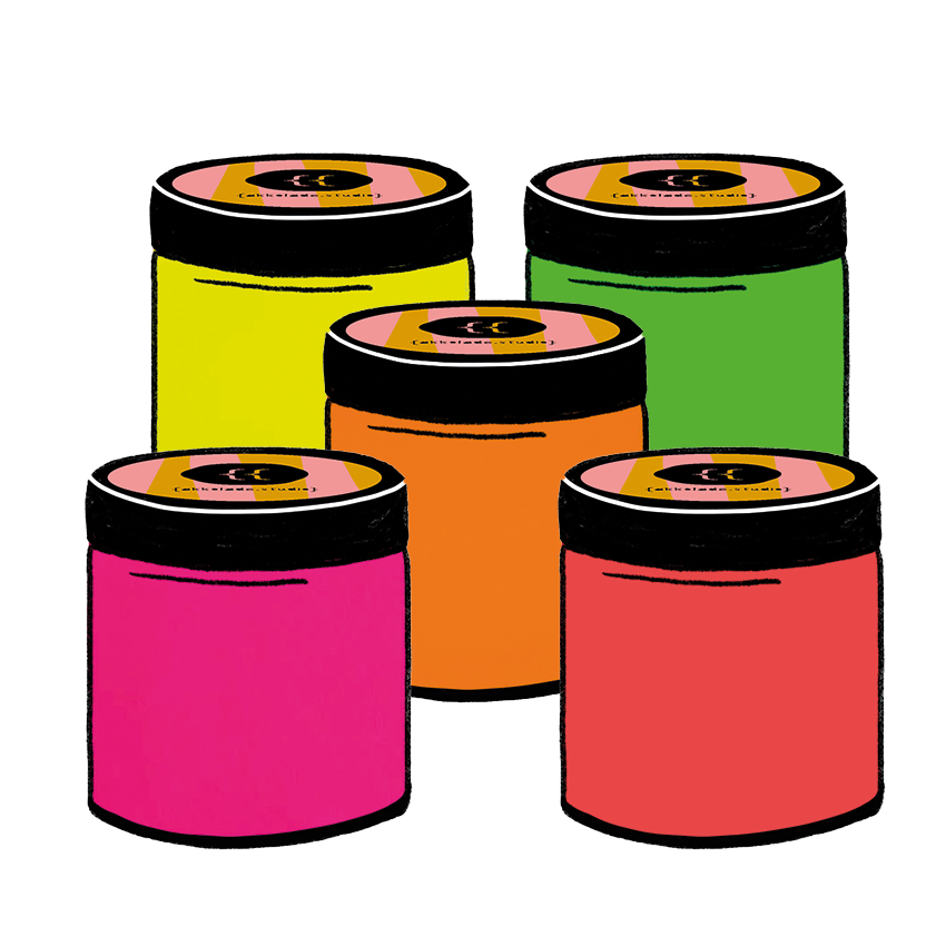 5x 100ml pro Glas. Neon Gelb, Neon Grün, Neon Orange, Neon Pink und Neon Rot.