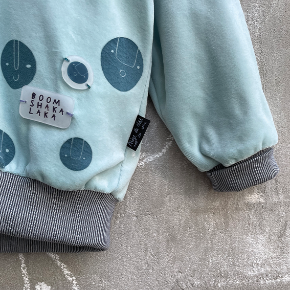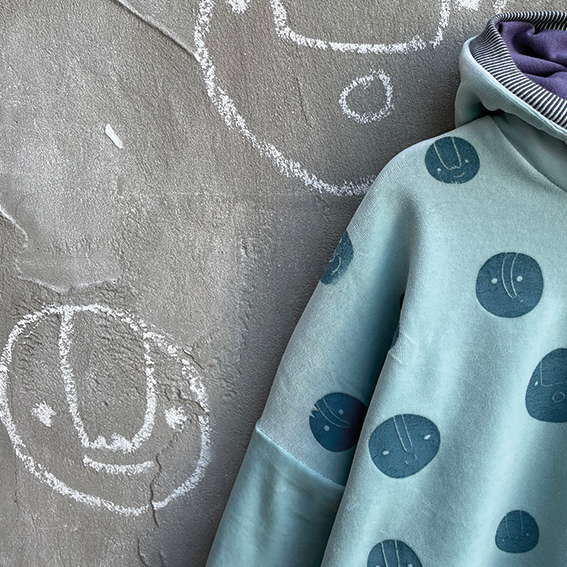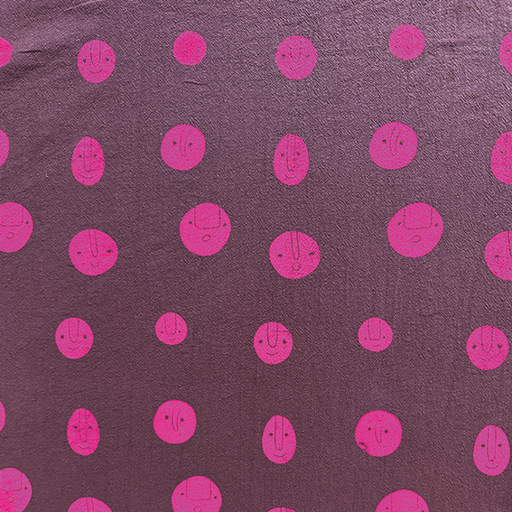 Hier sind die süßen Gesichter von Julia Marquardt-Lott, die auch einen schönen gleichmäßigen Rapport auf deinem Stoff ergeben. Du kannst ohne große Vorarbeit Meterware bedrucken oder mit der kleinen Rakel einzelne Gesichter drucken.