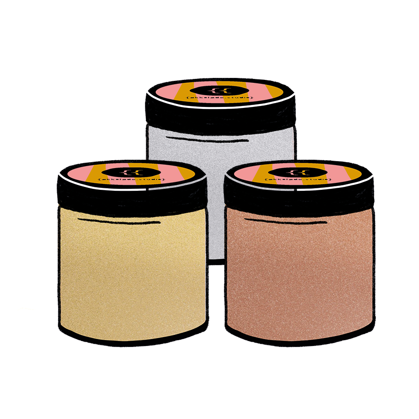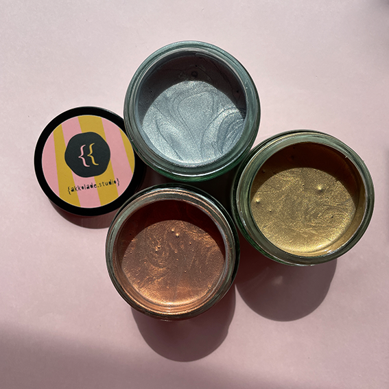 Here are my water-based metallic screen printing inks as a set, produced according to the highest standards, regionally, mixed by hand and filled into glasses by me. Harmless to the environment and great for creative time with the kiddos.